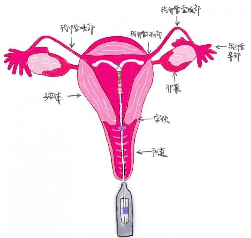 我们可以看到图中“宫腔”里有放了一个“曼月乐“,在放置的时候需要借助“宫腔镜”和图上的手柄一起操作。这个就是解决我们大部分女性痛经加月经量多的神器了。宫腔镜是一个细长的镜子,镜子两边有进出水口,镜子通过阴道、宫颈进入宫腔, 生理盐水通过进水口,这样宫腔就被撑起来,像打水气球似的,这样宫腔镜通过镜子就能清楚的看清宫腔内的具体情况。