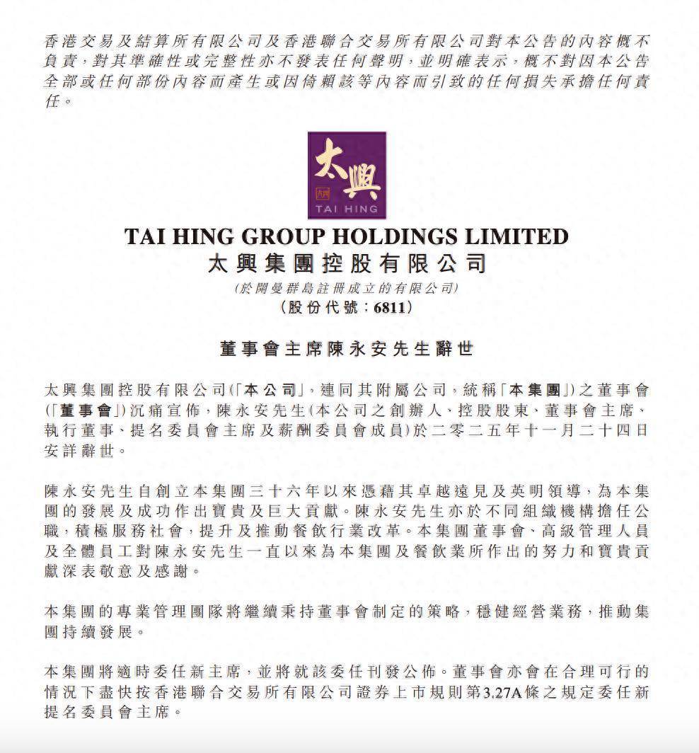 昨天(11月24日)22时许,知名连锁餐饮企业太兴集团在港交所发布公告称,太兴集团控股有限公司创办人、控股股东兼董事会主席陈永安于11月24日当天辞世。